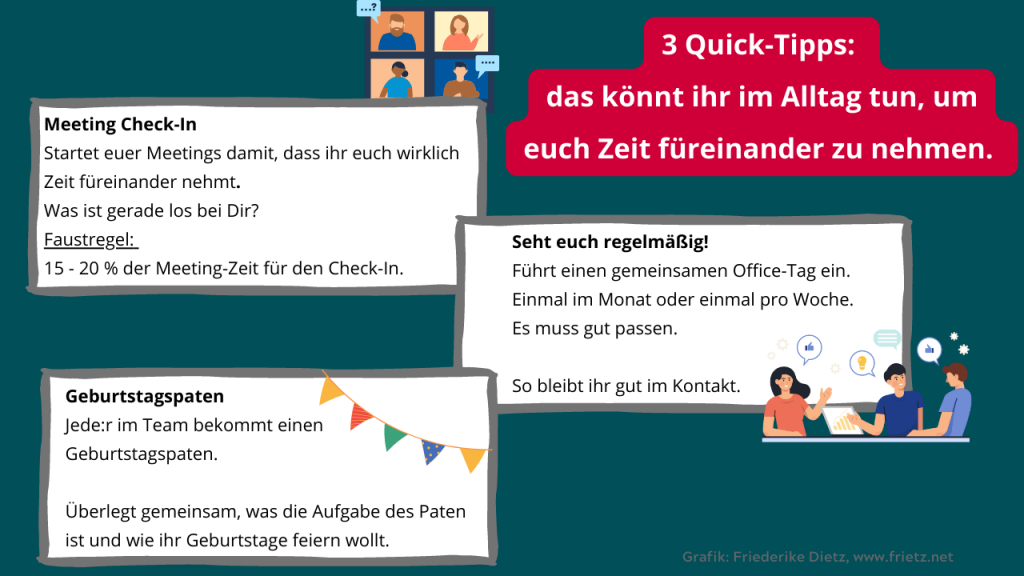 Das muss nicht immer in Präsenz sein. Wenn es aber irgendwie möglich ist, dann seht zu, dass ihr euch von Zeit zu Zeit Vor-Ort seht. Wenn, ihr euch in guten Zeiten abseits vom Tagesgeschäft Zeit füreinander nehmt, versteht ihr besser, wie ihr den anderen zu nehmen habt. Nur dann, wenn Du jemanden gut kennst, kannst Du etwas ansprechen was nicht gut läuft – und zwar auf eine gute Art. So baust Du vor für anstrengende und stressige Zeiten. Durch die kommt ihr dann einfach besser durch. Das nennt man „Konfliktkompetenz“. Klar, da gehört noch ein bisschen mehr dazu, sich regelmäßig zu sehen und auszutauschen ist ein wichtiger Anfang!